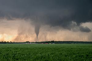 A "drill-bit" tornado in late afternoon light in central Oklahoma