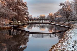 The setting sun adds pastel colors to ice laden trees in Lakeview Park.