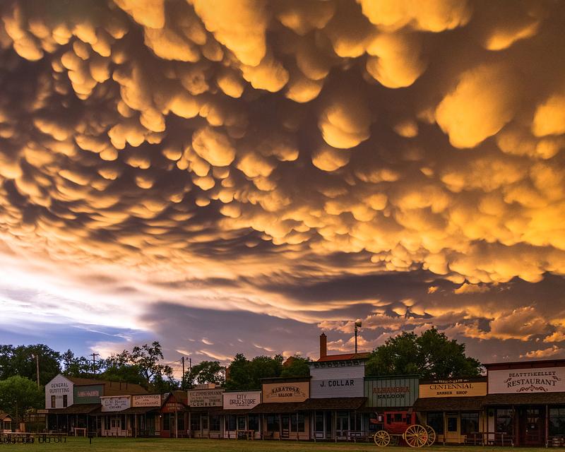 Mammatus filled sky over the town of Dodge City, KS